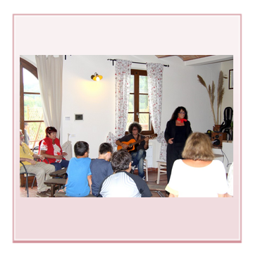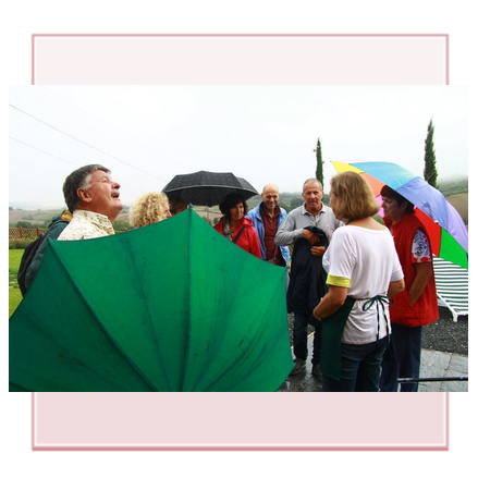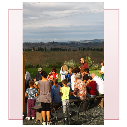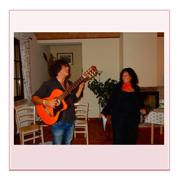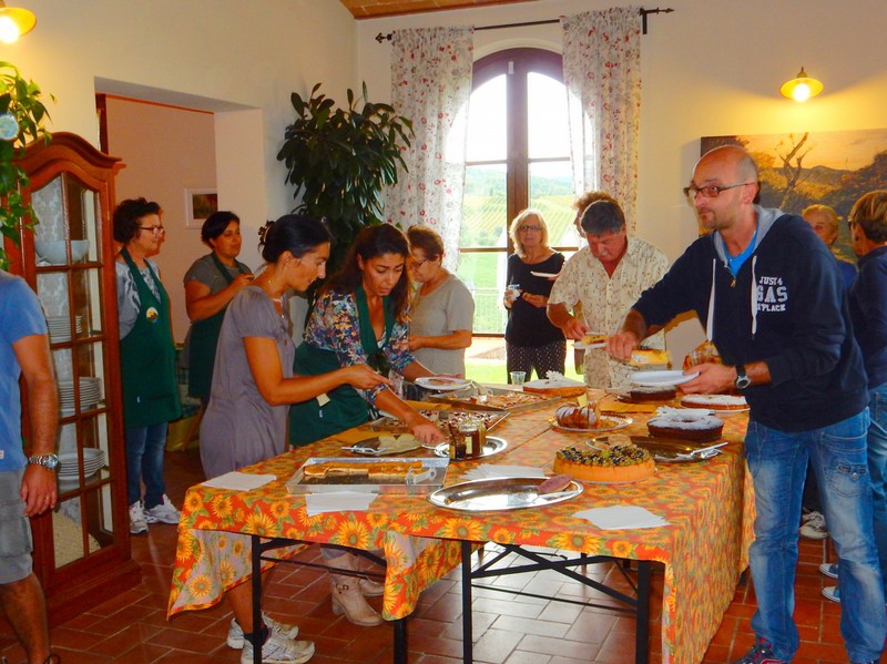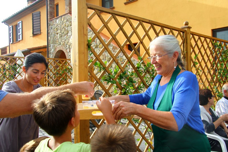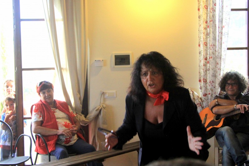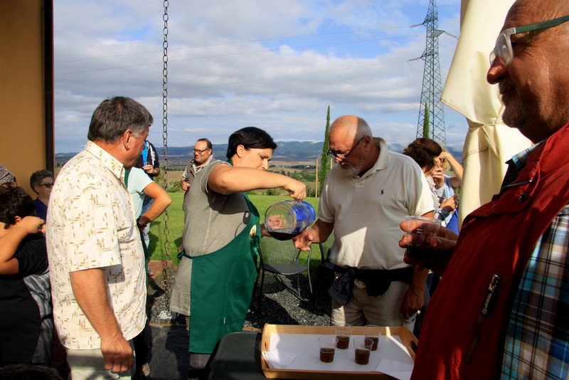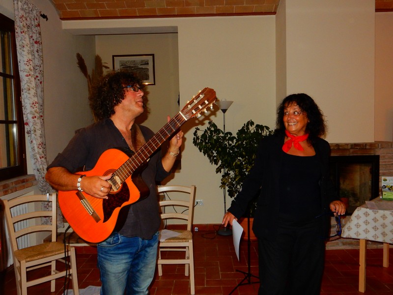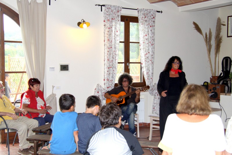 Torna a parlare Beppe Landi svelandoci i segreti della potatura delle viti ed infine iniziano ad esibirsi i musicisti d’eccezione Maria Torrigiani (voce) e Marco del Giudice (chitarra) con canti popolari interpretati in maniera strepitosa. Ascoltare la musica non impedisce ai nostri ospiti di assaporare la merenda di campagna fatta di tanti dolci casalinghi e schiacciatine molti dei quali preparati con l’ingrediente del giorno: l’uva; ci sono anche pane e olio, formaggi, miele, marmellate e l’immancabile ottimo vino locale della Fattoria di Paltratico che ci ha ospitato nel suo Podere Scaforno ed i cui vigneti si fanno parte dello scenario odierno.
