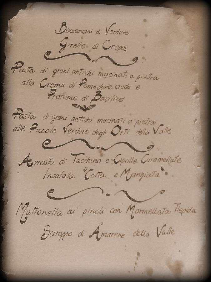antichi condite con le verdure ed i profumi estivi, la pietanza di carne ed infine la mattonella ai pinoli con le amarene e le marmellate casalinghe, in perfetto abbinamento con i vini bianchi, rossi e passiti prodotti nella valle, presentati e serviti dal nostro sommelier Giovanni.