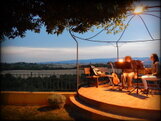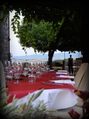 La tavola apparecchiata di tutto punto e intorno una cornice a dir poco spettacolare: come tetto una pergola di uva rara vecchia di decine d’anni dalla quale pendevano decine e decine di grappoli ed un affaccio mozzafiato sulla nostra valle e sui monti che fanno da cornice alla finestra aperta su macchie di boschi, casolari, biondi campi di grano, filari di cipressi che si snodano sui dolci crinali.